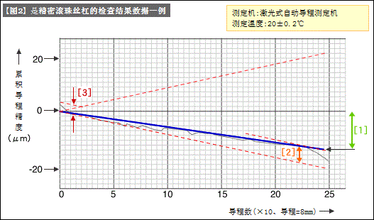 【圖2】是精密滾珠絲杠的檢查結(jié)果數(shù)據(jù)一例。實(shí)線是測(cè)定的數(shù)據(jù)
