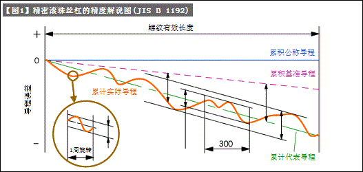 *導(dǎo)程精度:絲母的有效移動(dòng)距離或者絲杠的有效螺紋長(zhǎng)度累積代表導(dǎo)程誤差及變動(dòng),或者,導(dǎo)程誤差螺紋全長(zhǎng)內(nèi)任意300mm的變動(dòng)值或螺紋有效長(zhǎng)度內(nèi)任意一點(diǎn)旋轉(zhuǎn)一周變動(dòng)做出的規(guī)定(【圖1】)。在【表1】【表2】列出了其允許值。