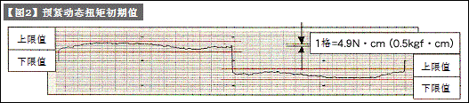 測(cè)量?jī)蓚€(gè)方向上的預(yù)加載扭矩,預(yù)緊動(dòng)態(tài)扭矩的標(biāo)準(zhǔn)值可以保證出貨品質(zhì)?!緢D2】是預(yù)緊扭矩= 20.6至37.2 N·cm。