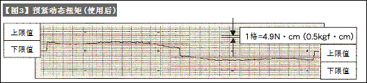 【圖3】表示的預(yù)緊動(dòng)態(tài)扭矩圖表是【圖2】所表示的滾珠絲杠經(jīng)過(guò)長(zhǎng)時(shí)間使用的結(jié)果,因?yàn)闈L珠絲杠的磨損等,預(yù)緊低下時(shí)候測(cè)定的預(yù)緊動(dòng)態(tài)扭矩?cái)?shù)據(jù)。測(cè)定值為9.8至24.5N·cm,與出貨時(shí)的初始值相比降低了30至40%。