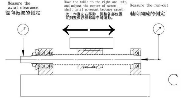 安裝螺桿時,用百分表或百分表測量螺桿支撐座的固定端(滾珠絲杠軸端的跳動量)和螺桿支撐座的支撐端(軸向間隙),并按技術(shù)要求進(jìn)行調(diào)整,以滿足機(jī)床的精度要求。