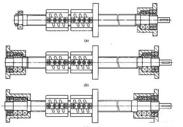 c)所示是兩端固定的支承形式,絲桿的軸向剛度約為一端固定形式的4倍,可預(yù)拉伸,這樣既可對滾珠絲桿施加預(yù)緊力,又可使絲桿受熱變形得到補償,保持恒定預(yù)緊力,但結(jié)構(gòu)工藝都較復(fù)雜,適用于長絲桿。
