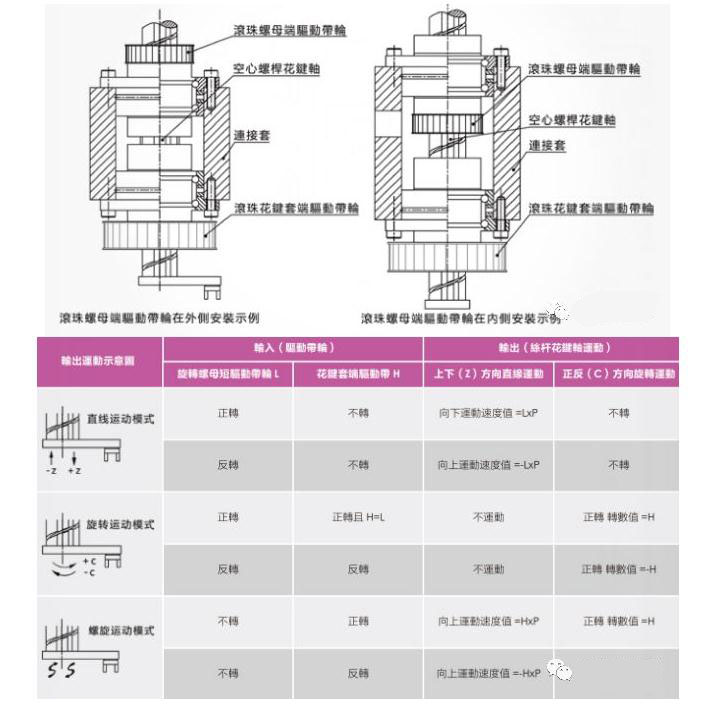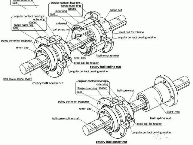 旋轉(zhuǎn)式滾珠螺桿花鍵則可通過(guò)讓 螺帽 / 外筒旋轉(zhuǎn)或停止的運(yùn)作,只用一根軸就能夠進(jìn)行 3 種 (旋轉(zhuǎn)、螺旋、直線)模式的運(yùn)動(dòng) 。