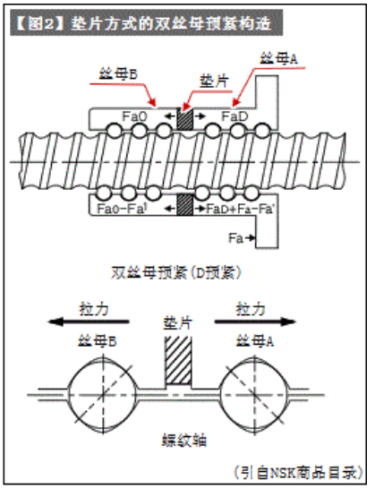 4、墊片方式:在兩個絲母構造之間加入預緊量的墊圈(墊片)進行預緊的方法