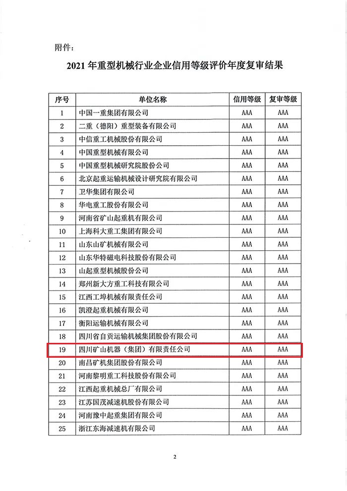 川礦集團再獲重型機械行業(yè)AAA信用等級
