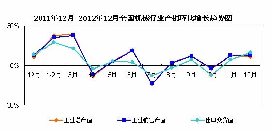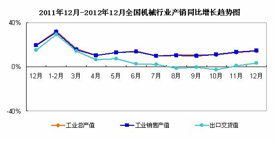 統(tǒng)計(jì)數(shù)據(jù)顯示,2012年1-12月,全國(guó)機(jī)械工業(yè)經(jīng)濟(jì)運(yùn)行速度同比持續(xù)呈現(xiàn)回升的態(tài)勢(shì)。12月份,工業(yè)總產(chǎn)值的累計(jì)同比增速為14.24%;工業(yè)銷(xiāo)售產(chǎn)值的累計(jì)同比增速為14.64%,出口交貨值的累計(jì)同比增速為3.26%。