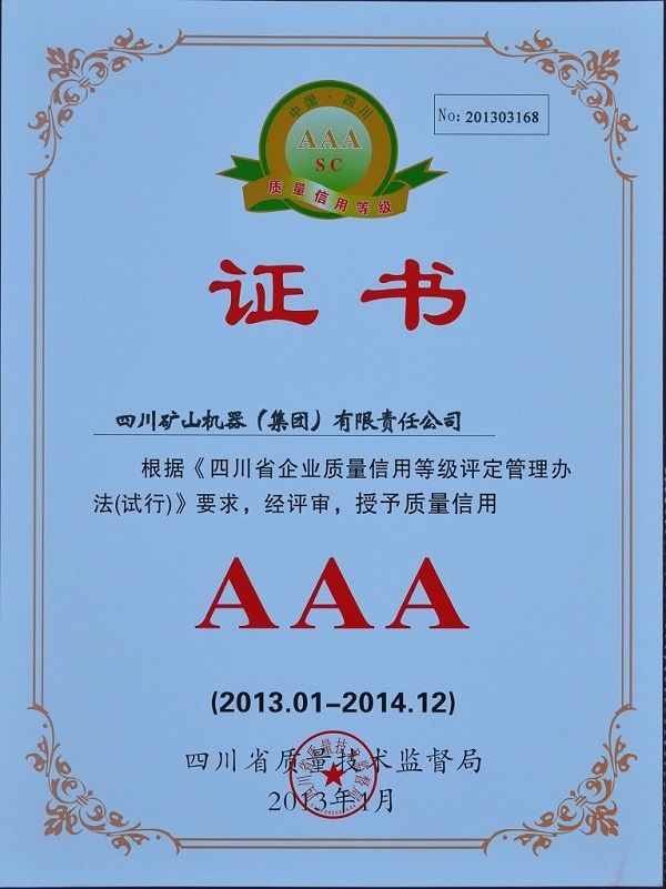 川礦集團公司日前,從省質(zhì)檢局獲悉,四川礦山機器(集團)有限責任公司喜獲“四川省企業(yè)質(zhì)量信用等級AAA級企業(yè)”稱號,并頒發(fā)了榮譽證書。