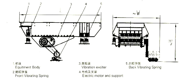 振動給料機是由給料槽體、激振器、彈簧支座、傳動裝置等組成。槽體振動給料的振動源是激振器,激振器是由兩根偏心軸(主、被動)和齒輪副組成,由電動機通過三角帶驅(qū)動主動軸,再由主動軸上齒輪嚙合被動軸轉(zhuǎn)動,主、被動軸同時反向旋轉(zhuǎn),使槽體振動,使物料連續(xù)不斷流動,達到輸送物料的目的。